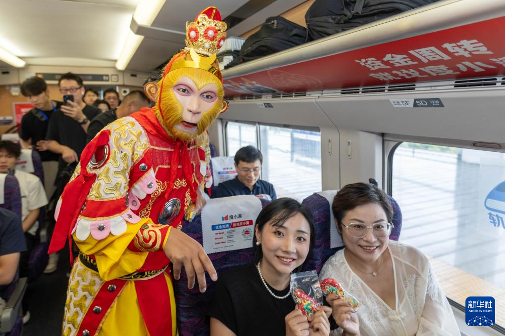 6月15日,在G8388次列车上,演员扮演美猴王为乘客送上纪念品。