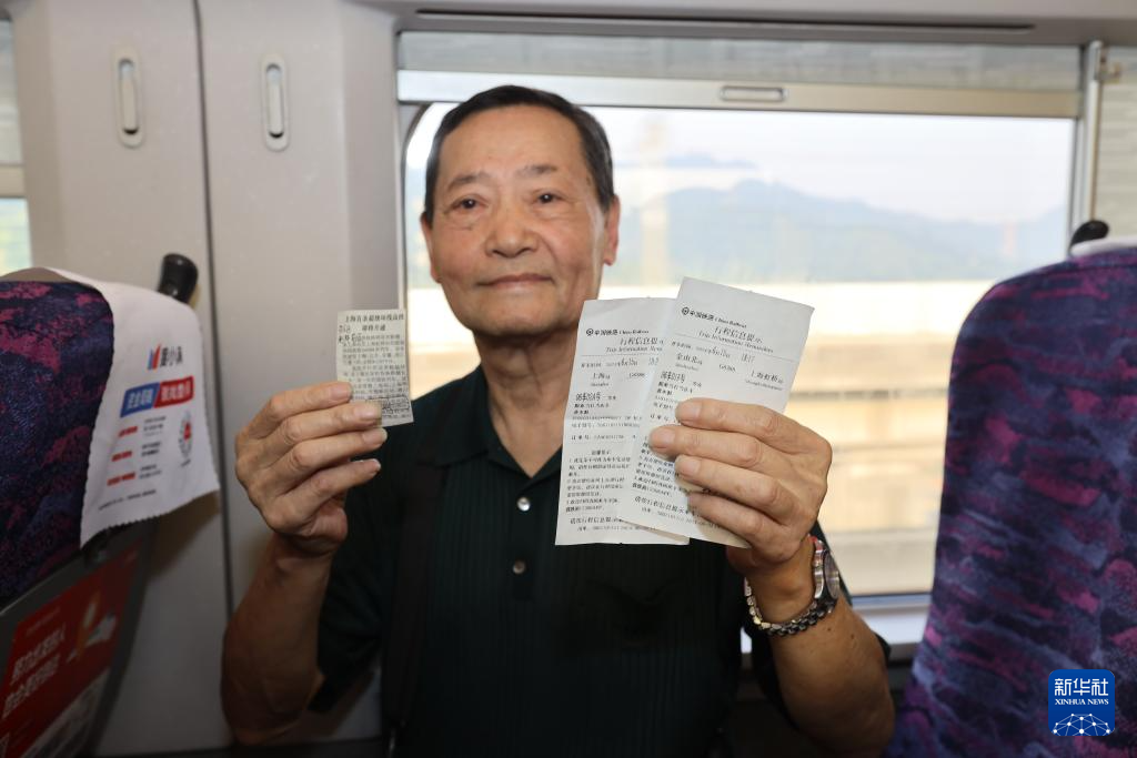 6月15日,上海老人龚本源在列车上展示行程信息提示单和从报纸上剪裁的首条长三角列车“环线”开行信息。