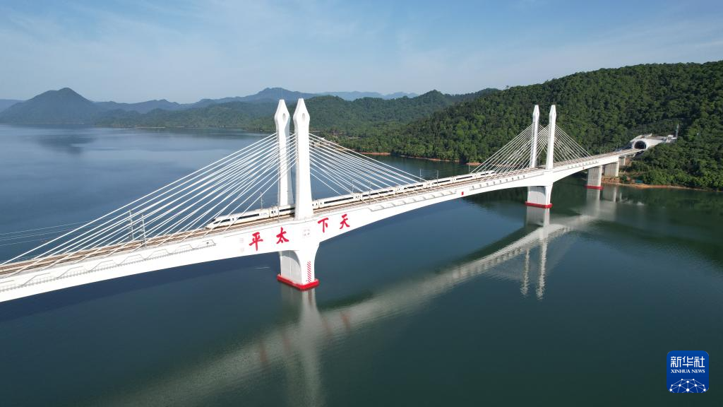 6月15日,超级“环线”列车通过位于安徽省黄山市的太平湖特大桥。