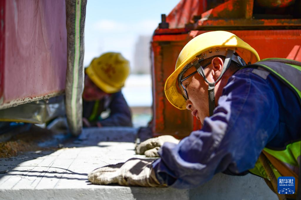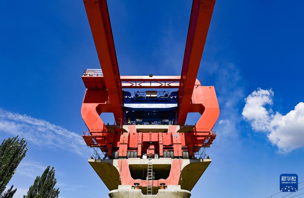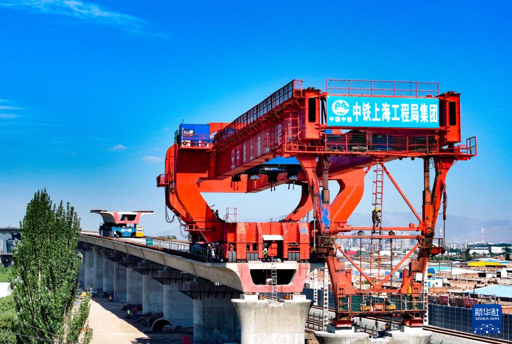 6月15日,建设者在包银高铁跨昆都仑河特大桥预制箱梁架设现场作业。
