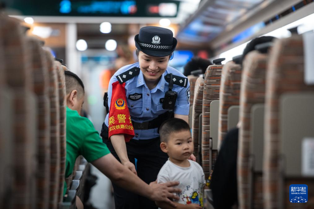6月15日,在武汉至深圳北的G875次列车上,乘警在引导小朋友回到座位。