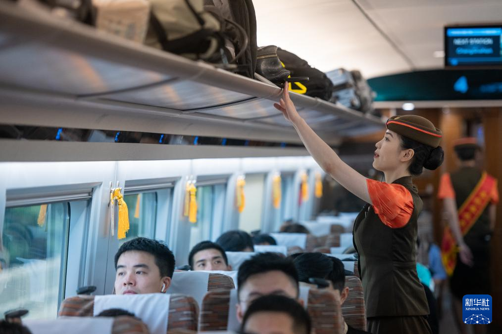 6月15日,在武汉至深圳北的G875次列车上,乘务员在整理行李架。