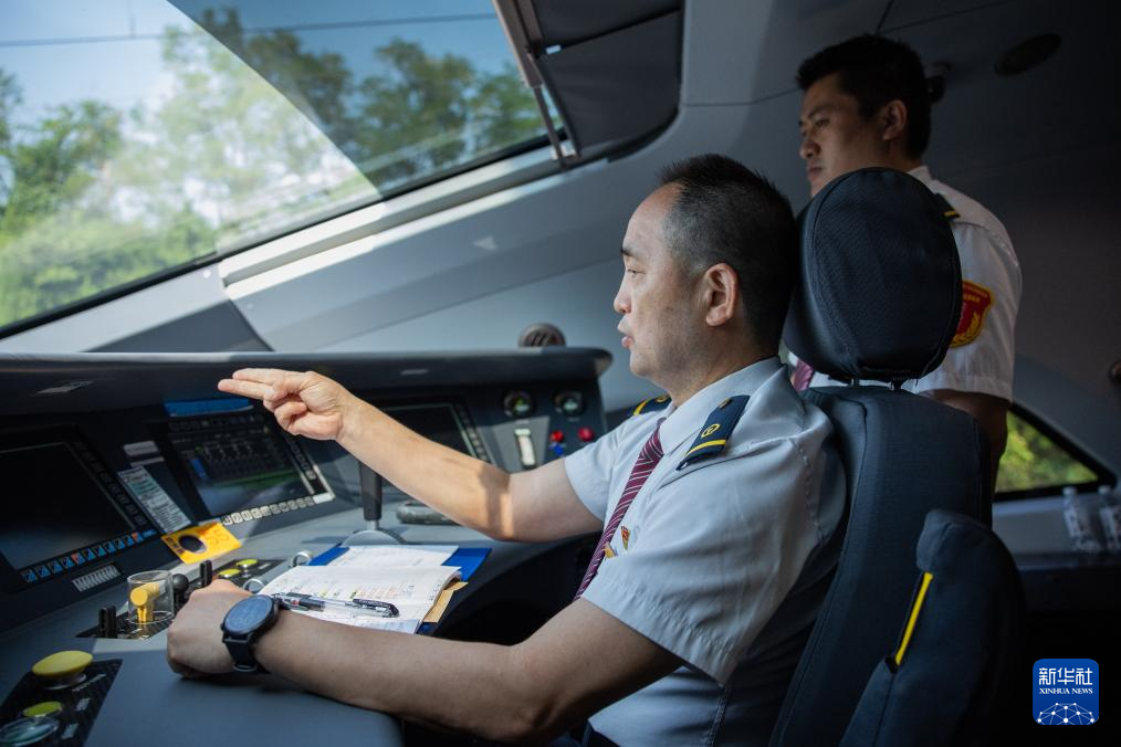 6月15日,在武汉至深圳北的G875次列车上,动车组司机在确认行车安全装备状态。