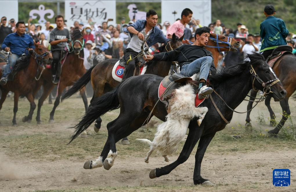 6月15日在“夏牧场·游牧文化旅游节”活动上拍摄的叼羊比赛。