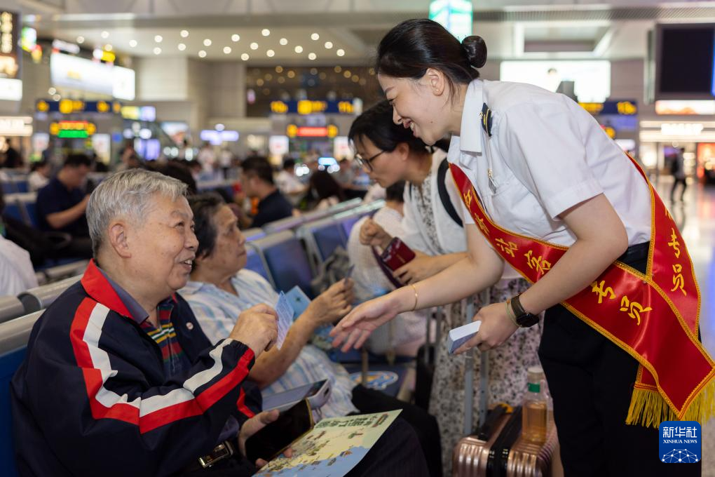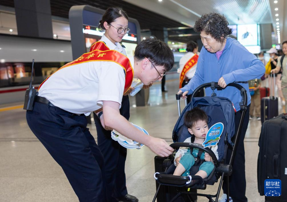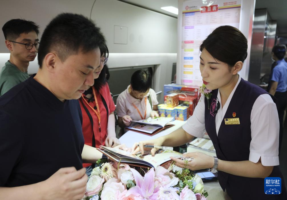 6月15日,铁路上海虹桥站工作人员向乘坐上海虹桥至香港西九龙D907次高铁动卧列车的旅客发放纪念品。新华社记者 王翔 摄pagebreak