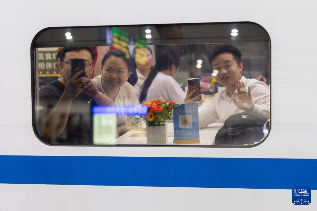 6月15日,乘客在香港西九龙至上海虹桥D908次高铁动卧列车上合影留念。新华社记者 褚萌萌 摄pagebreakpagebreak