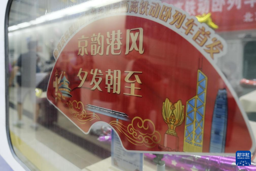 这是6月15日拍摄的首班香港西九龙至北京西D910次高铁动卧列车车窗上的宣传画。新华社记者 王申 摄pagebreak