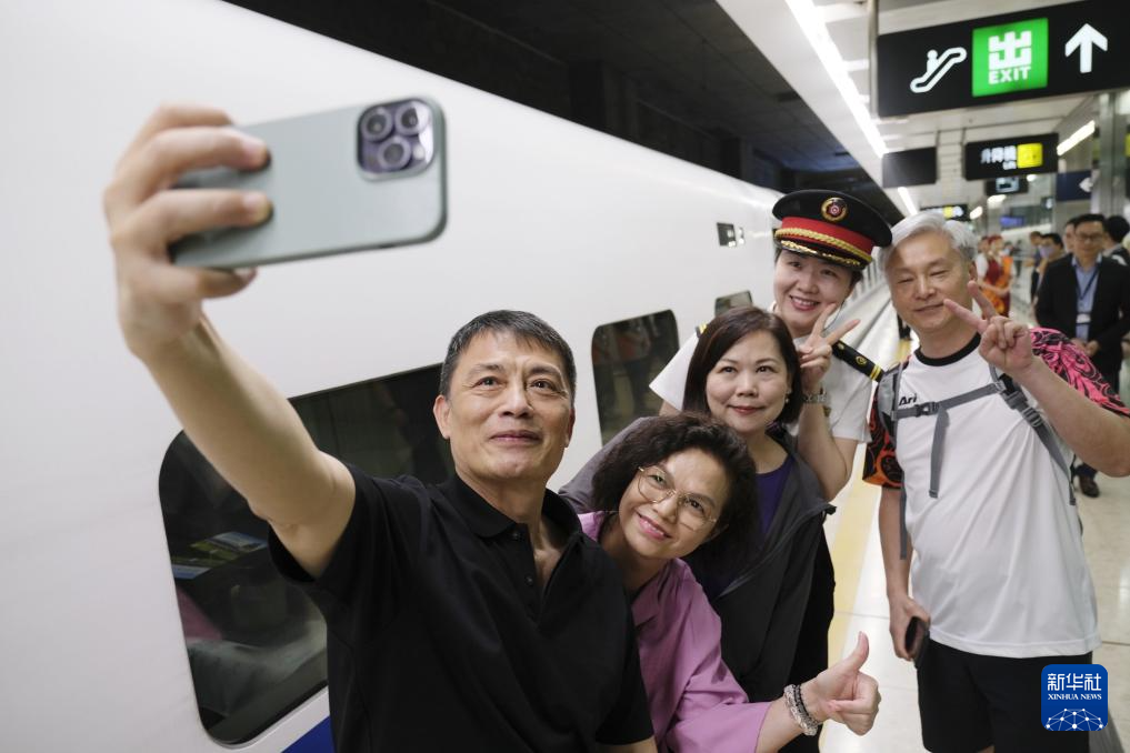6月15日,乘坐上海虹桥至香港西九龙D907次高铁动卧列车的旅客在站台拍照留念。新华社记者 王翔 摄pagebreak