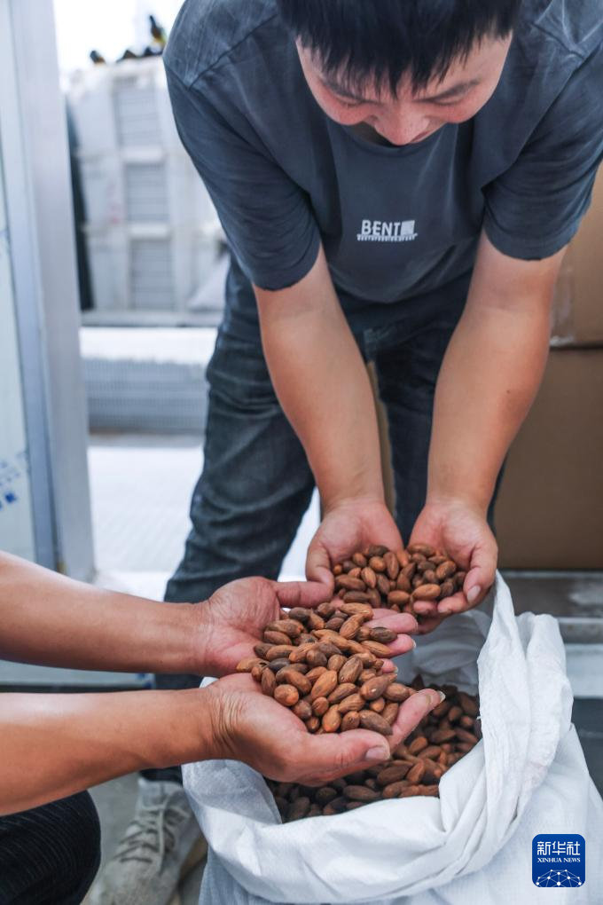 6月15日,在位于建德市三都镇松口工业园的香榧油共富工坊,工作人员在查看香榧果原料。