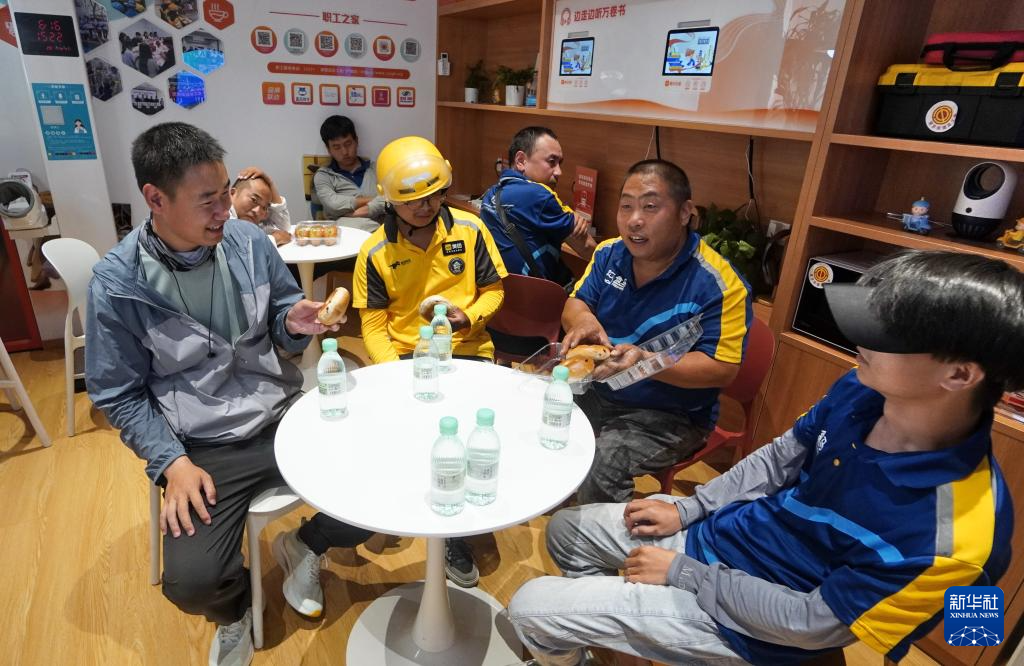6月16日,外卖配送员、快递员在工会驿站内拿取免费冷饮。