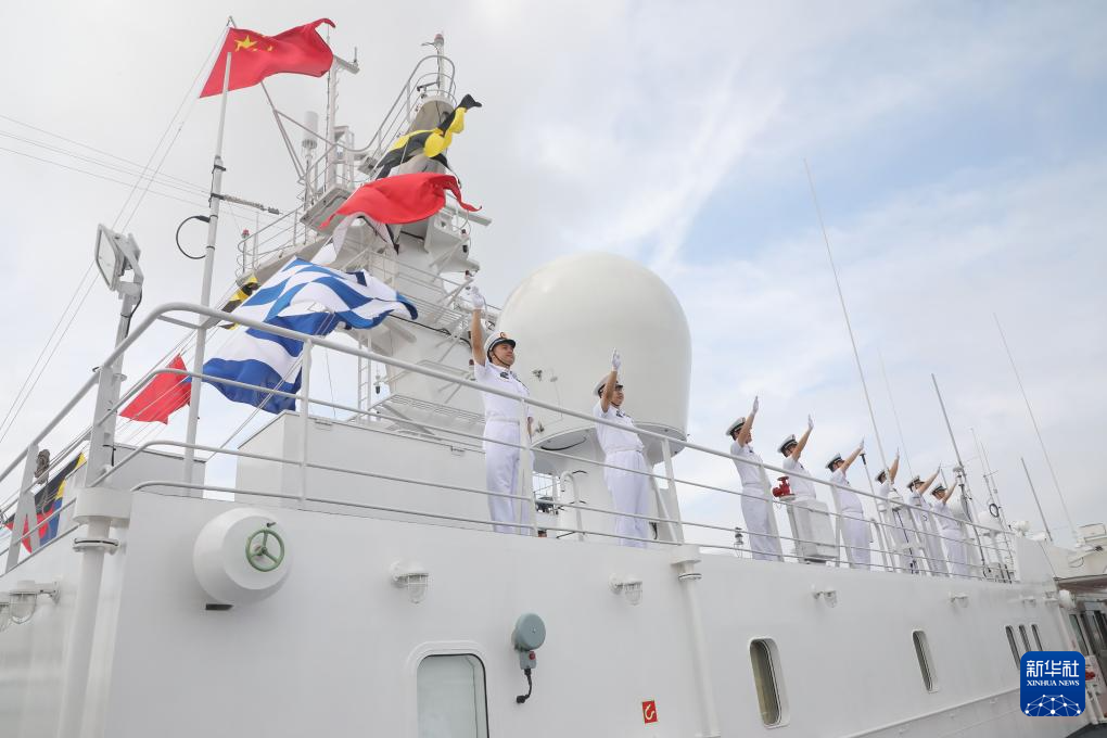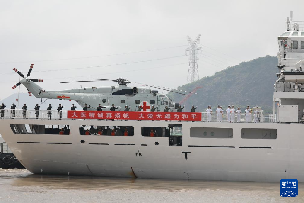 6月16日,中国海军“和平方舟”号医院船从浙江舟山某军港码头解缆起航,执行“和谐使命-2024”任务。这是任务官兵在挥手告别。