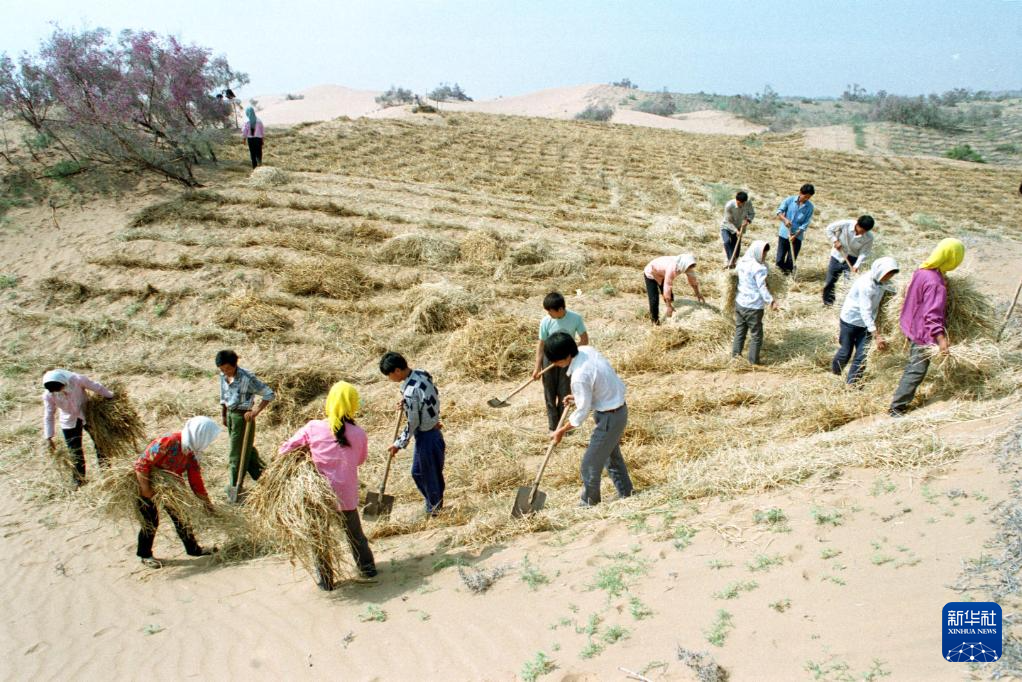 宁夏中卫固沙林场职工在扎麦草方格(1994年9月24日摄)。