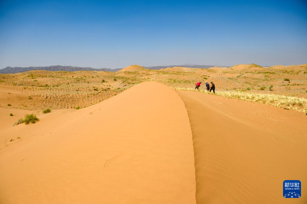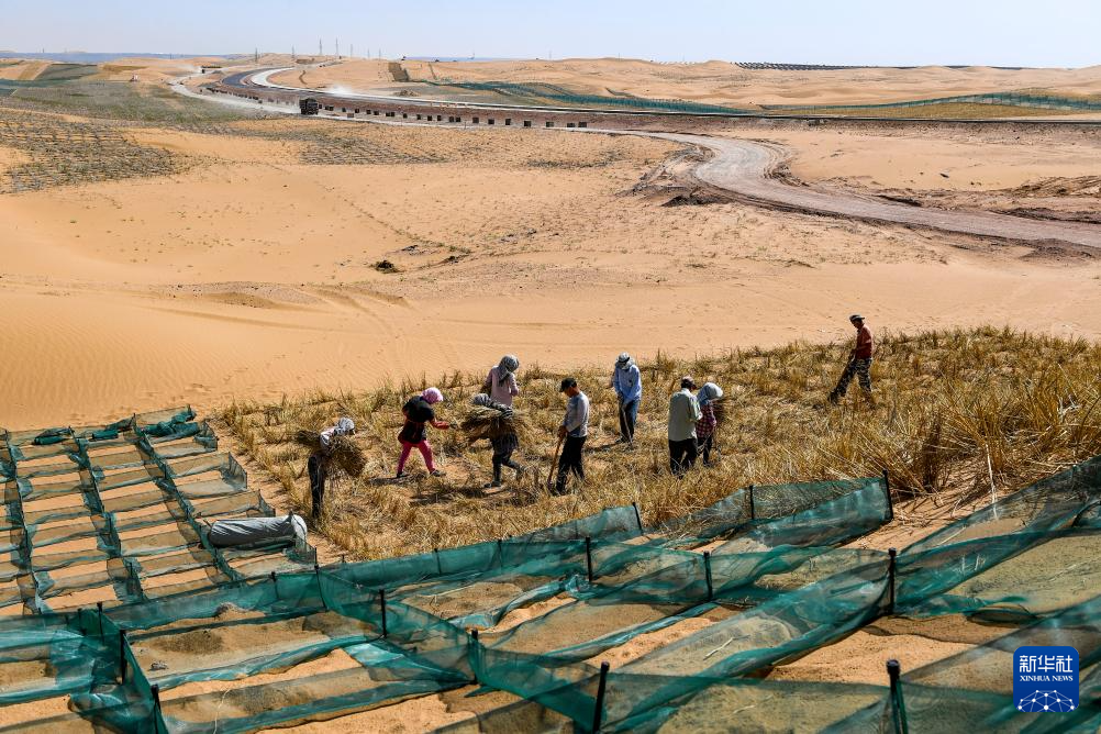 治沙工人在穿越腾格里沙漠腹地的乌玛高速青铜峡至中卫段扎草方格(2020年9月7日摄)。路基两侧修建了由前沿阻沙栅栏带、高立式大网格沙障带、防风固沙林带等构成的“六带一体”防护体系。
