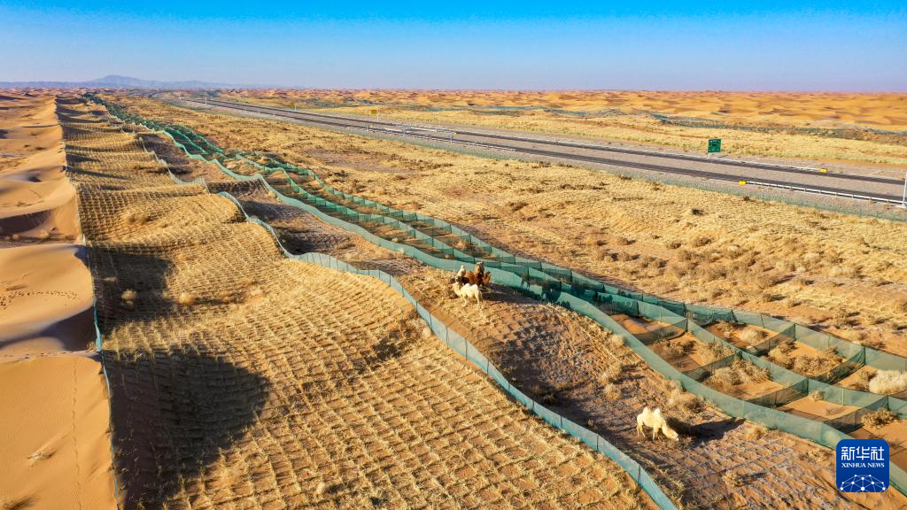 乌玛高速青铜峡至中卫段穿越腾格里沙漠的路段,两侧设置了生态防护带(2021年12月29日摄,无人机照片)。