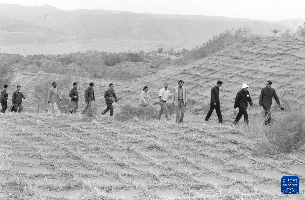 联合国环境规划署在中国举办沙漠化防治讲习班,来自多国的外宾在中卫参观考察草方格情况(1981年10月14日摄)。