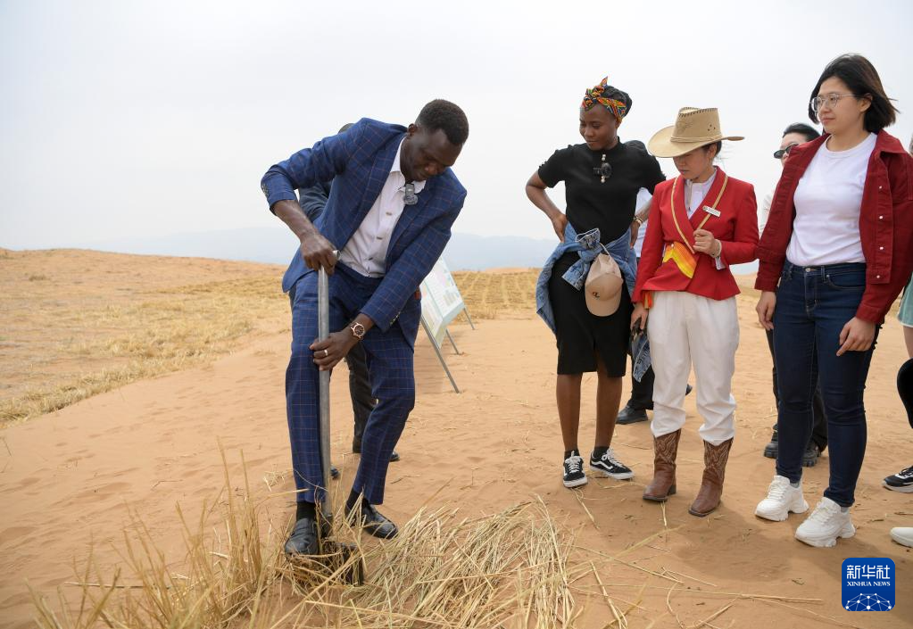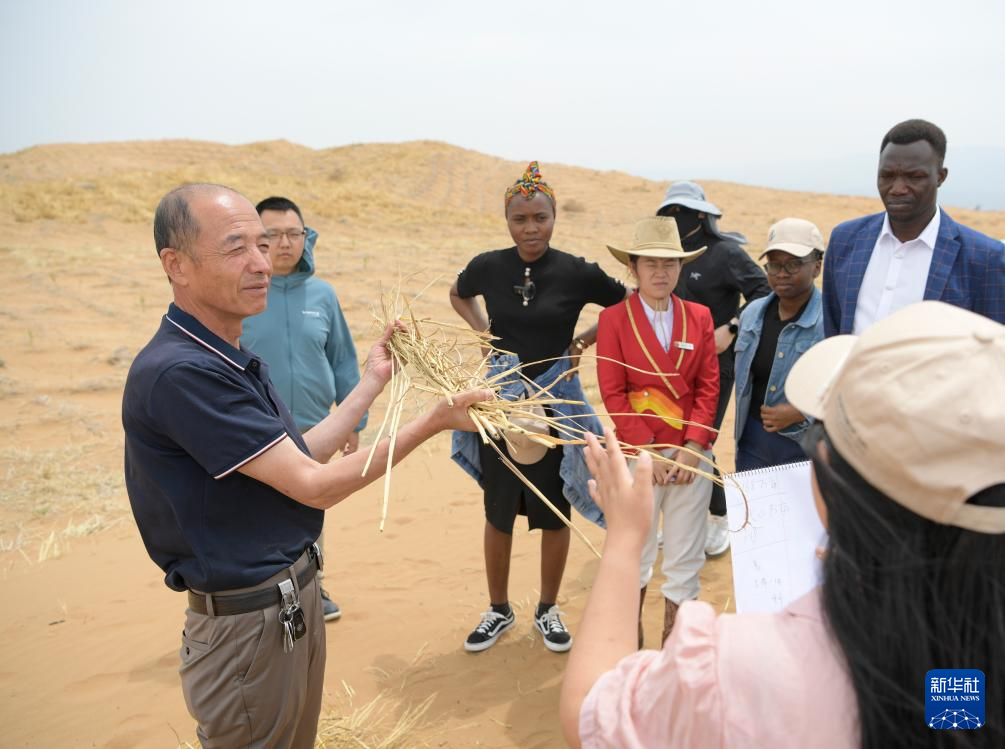 中卫市国有林业总场林业工程师唐希明(左一)向多国青年介绍草方格使用的麦草(5月31日摄)。