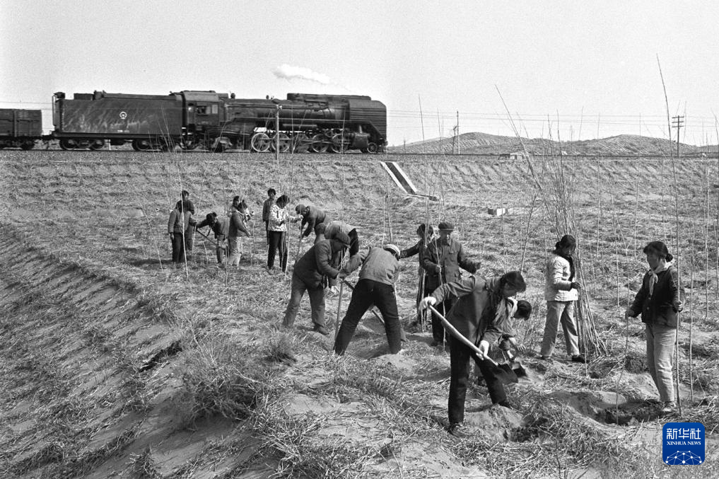宁夏中卫固沙林场的职工在包兰铁路两侧草方格里栽种树苗(1979年4月25日摄)。