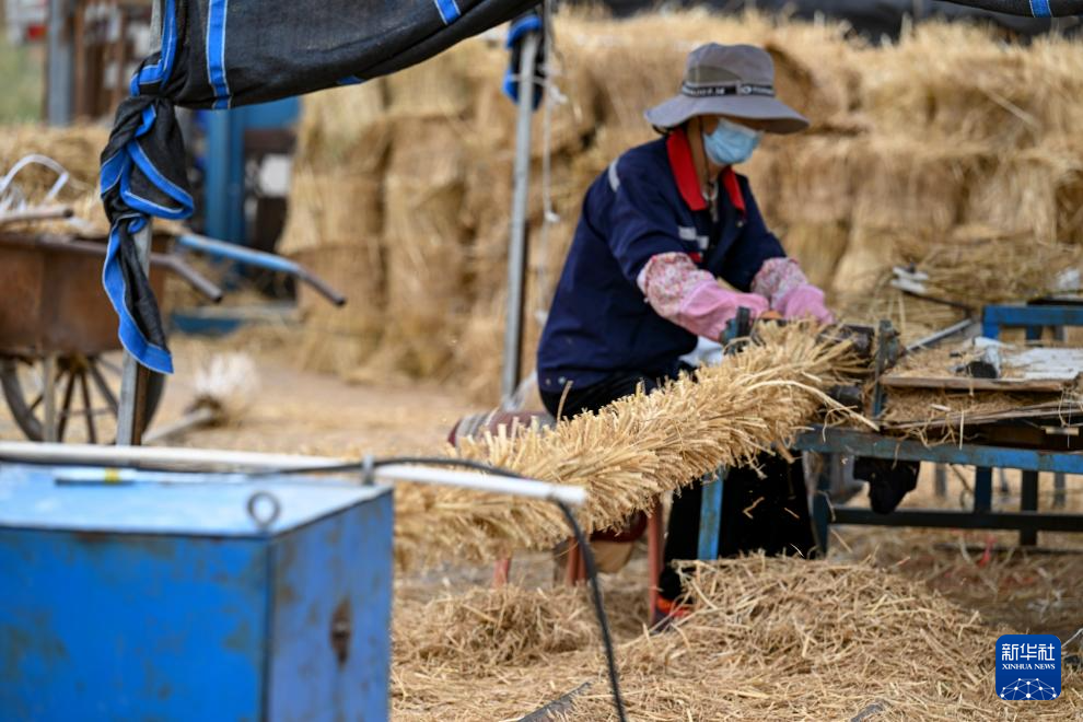 工人在生产加工刷状网绳式草方格沙障(5月29日摄)。