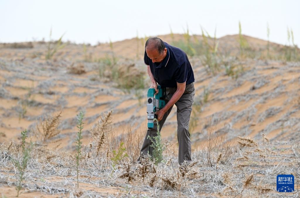 中卫市国有林业总场林业工程师唐希明在演示他发明升级的电动植苗工具,进一步提高栽种效率(6月1日摄)。