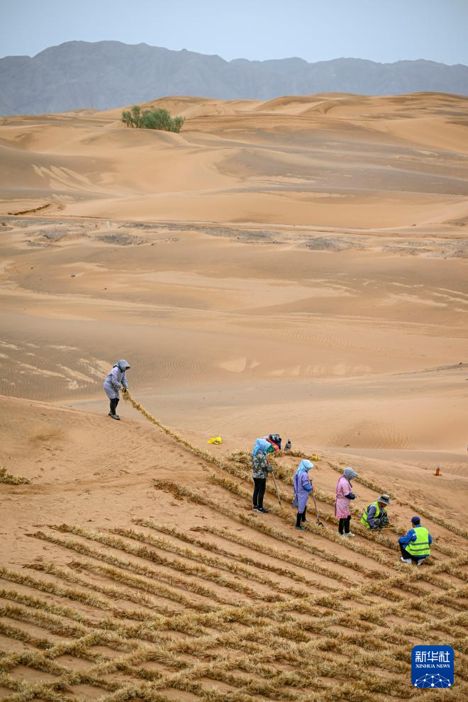 治沙工人在宁夏中卫市境内的腾格里沙漠铺设刷状网绳式草方格沙障(5月30日摄)。