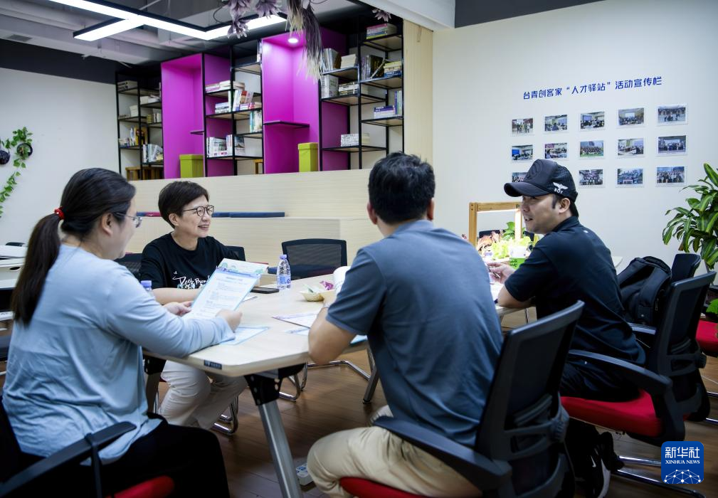 在厦门“台青创客家”路演大厅里,负责人虞慧芳(左二)与团队成员沟通交流(6月14日摄)。