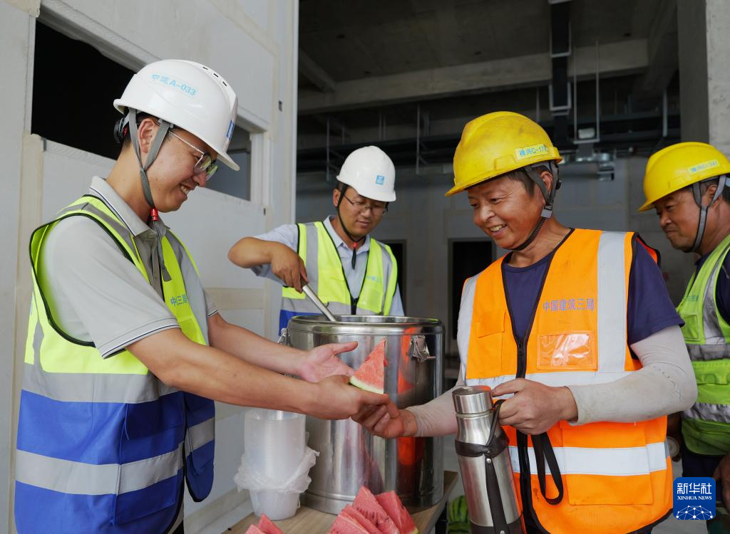 6月17日,在位于河南郑州的上海龙华医院河南医院项目工地,中建三局工程管理人员为工人发放西瓜与绿豆汤。