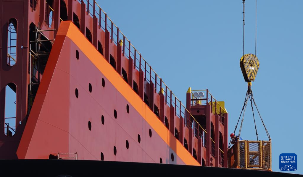 6月15日,在中国船舶集团大连船舶重工集团有限公司拍摄的制造中的16000TEU集装箱船。