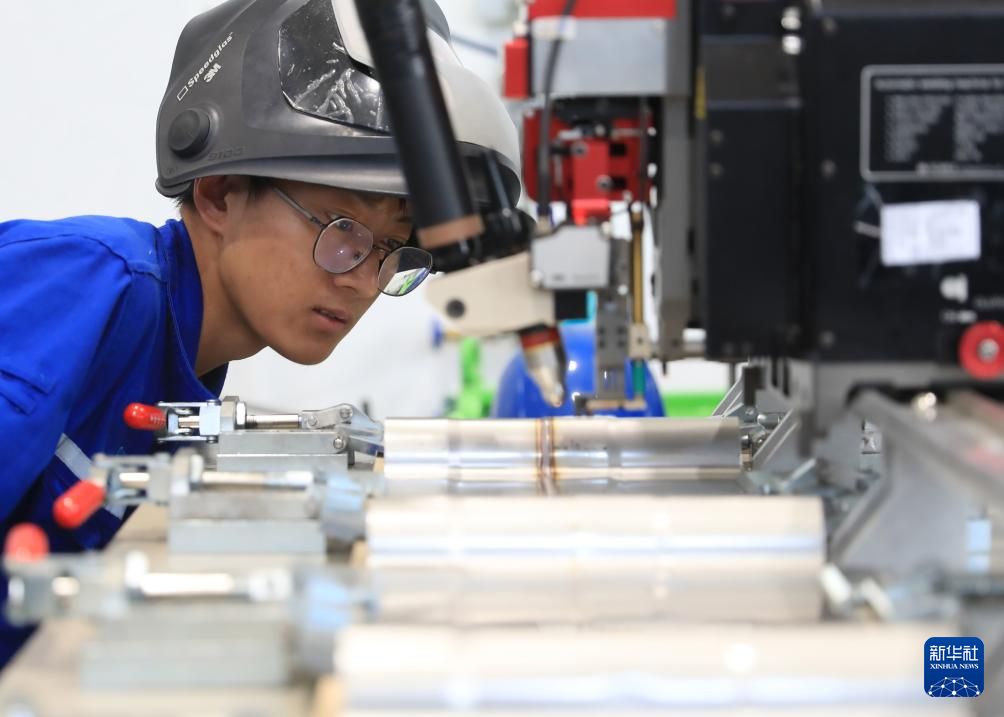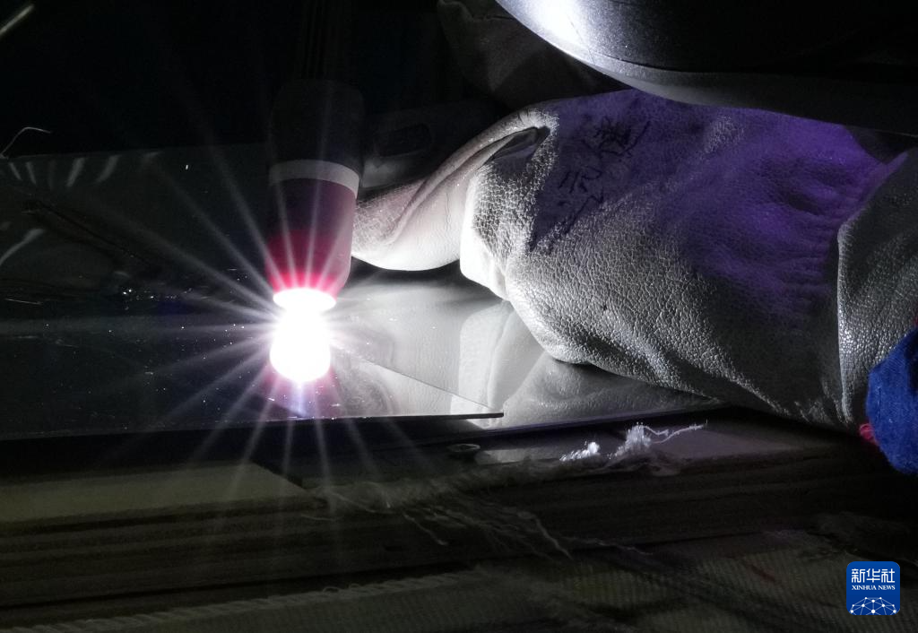 6月15日,中国船舶集团大连船舶重工集团有限公司LNG综合培训中心,一名学员在练习波纹板自动焊接作业。