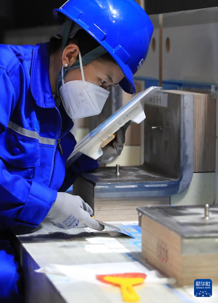 6月15日,中国船舶集团大连船舶重工集团有限公司LNG综合培训中心,一名学员在练习次屏壁手工粘连作业。