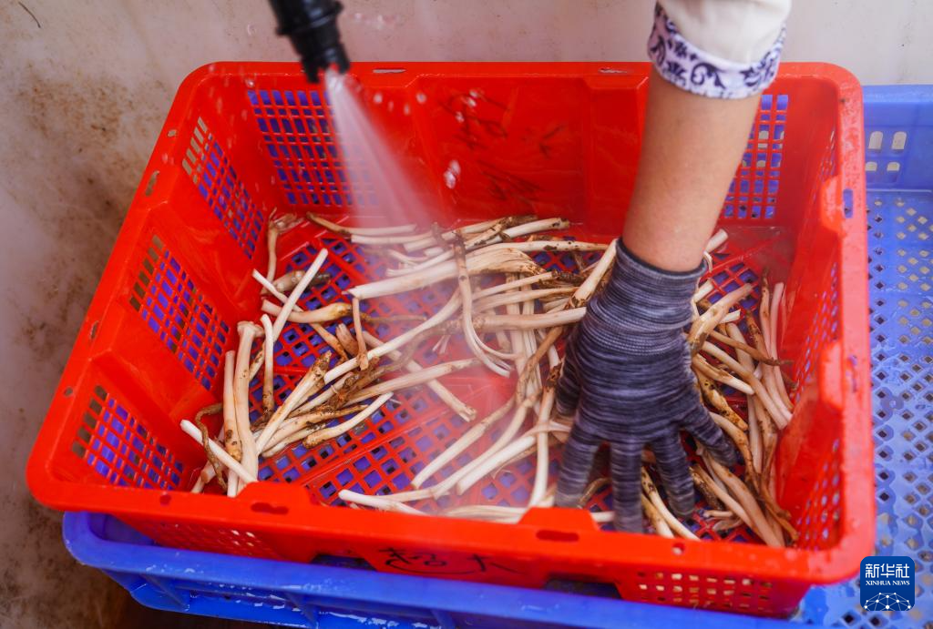 6月17日,工作人员在位于昆明的云南木水花野生菌交易市场用高压水枪为顾客清洗野生菌。