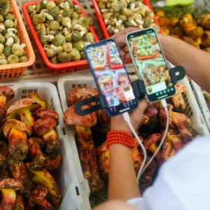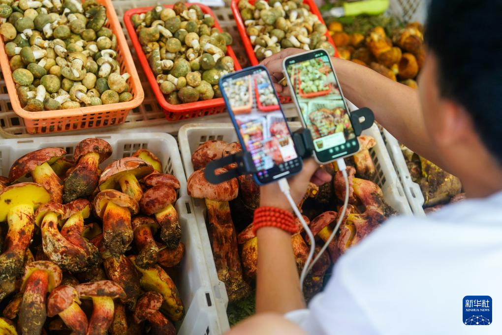 6月17日,一名主播在位于昆明的云南木水花野生菌交易市场推销野生菌。