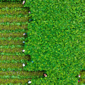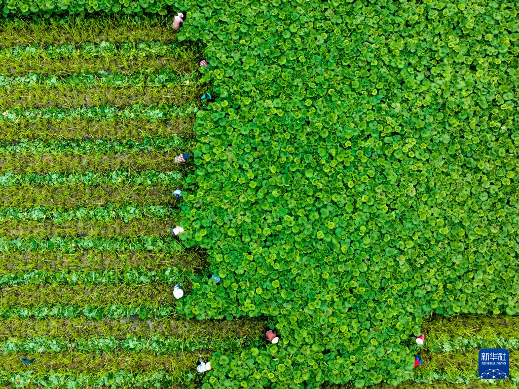 6月17日,浙江省湖州市吴兴区埭溪镇上强村村民在收割蜂斗菜(无人机照片)。