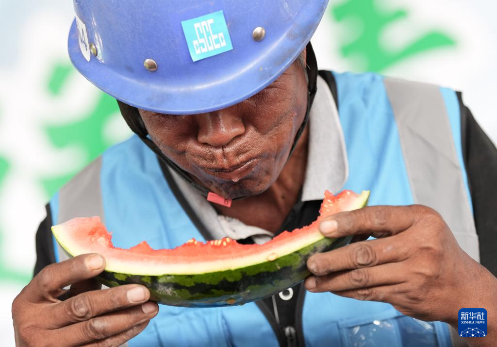 6月18日,在河北省廊坊市人民医院迁建项目施工现场,工友参加吃西瓜比赛。
