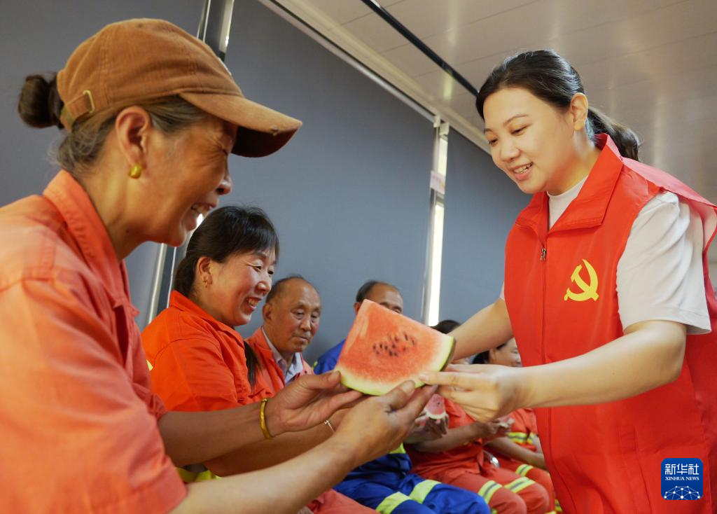 6月18日,在吉林省长春市朝阳区城南大路一处作业现场,国网长春供电公司工会工作人员(左一)给带电作业班组工人准备西瓜。