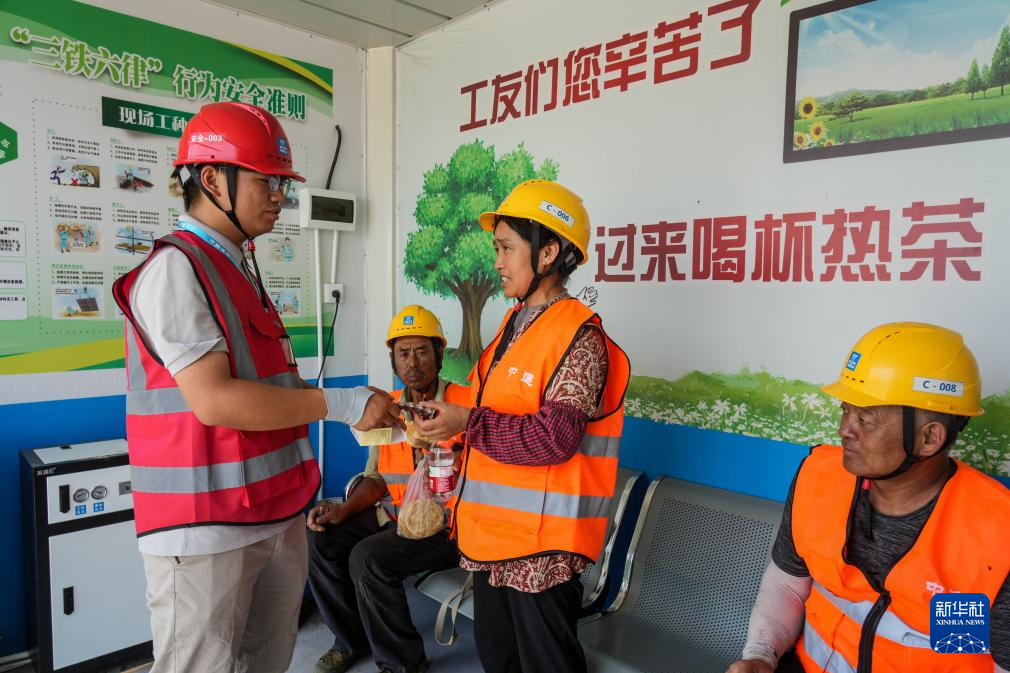 6月18日,中铁十二局工人在河北雄安新区大河片区安置房项目建设现场喝水解暑。