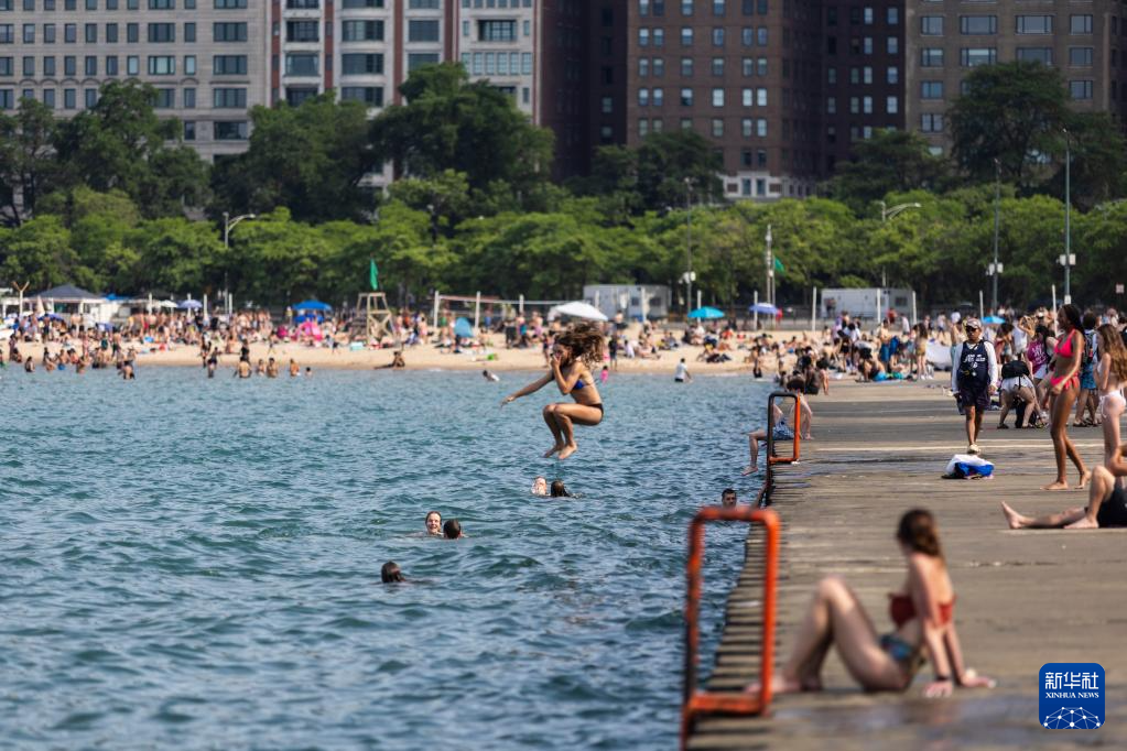 6月17日,人们在美国芝加哥密歇根湖戏水消暑。