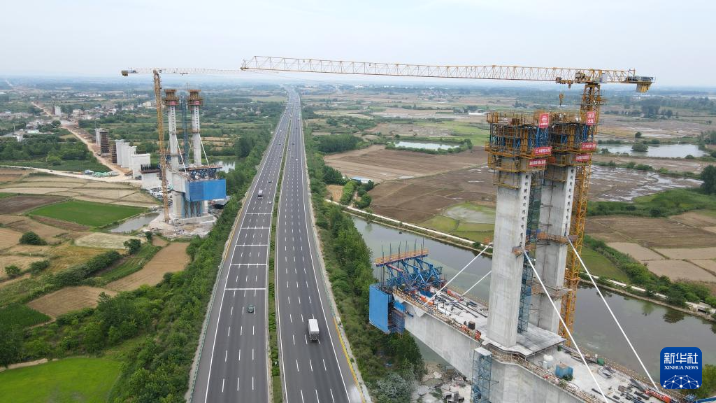 这是新建沪宁合高铁跨沪陕高速公路特大桥主桥塔柱封顶施工现场(6月18日摄,无人机照片)。