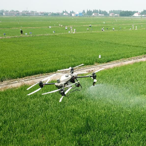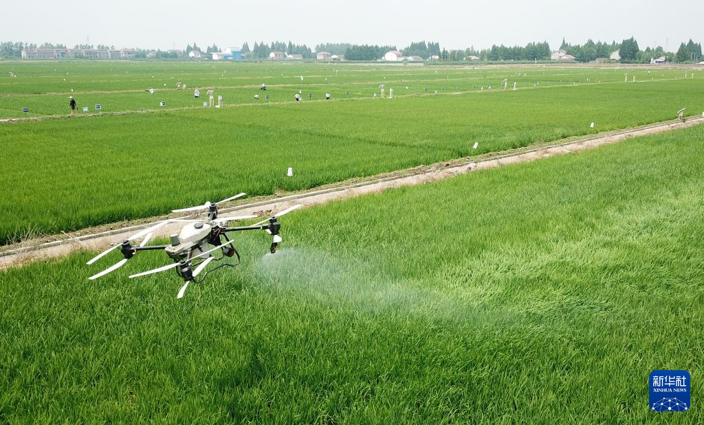 6月6日,植保无人机在湖南省益阳市大通湖区再生稻无人农场作业。