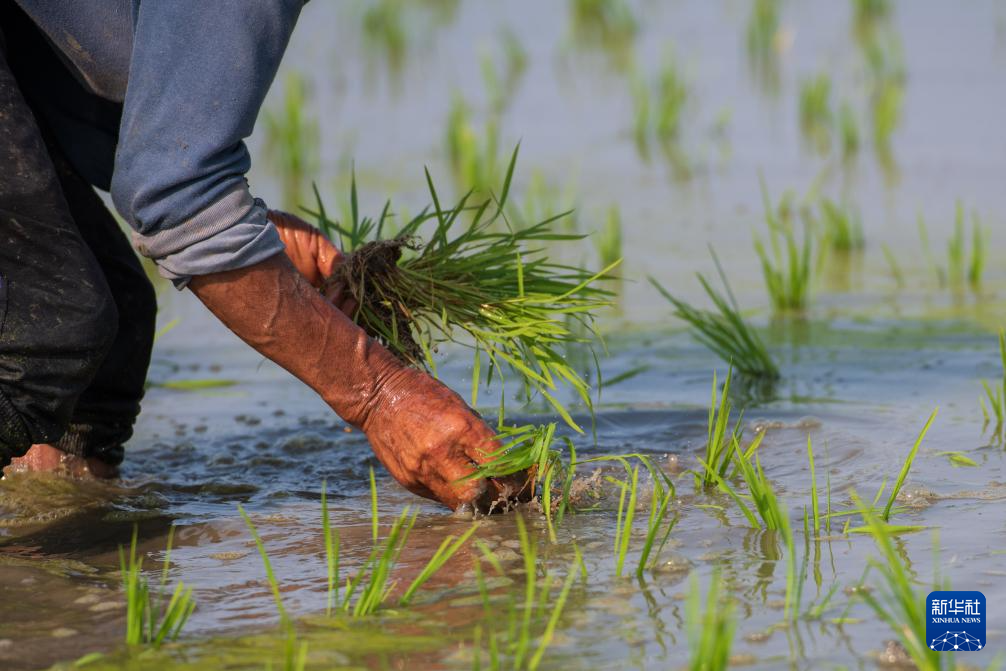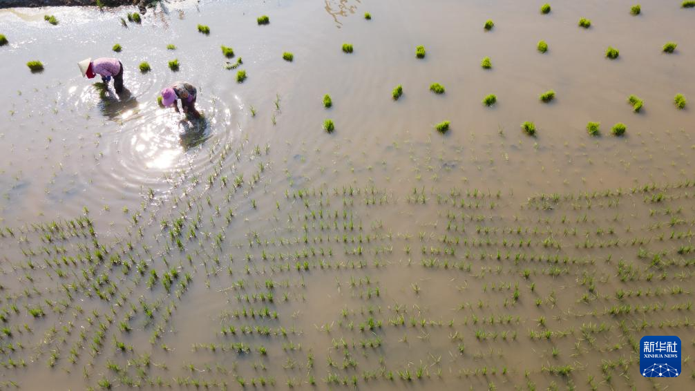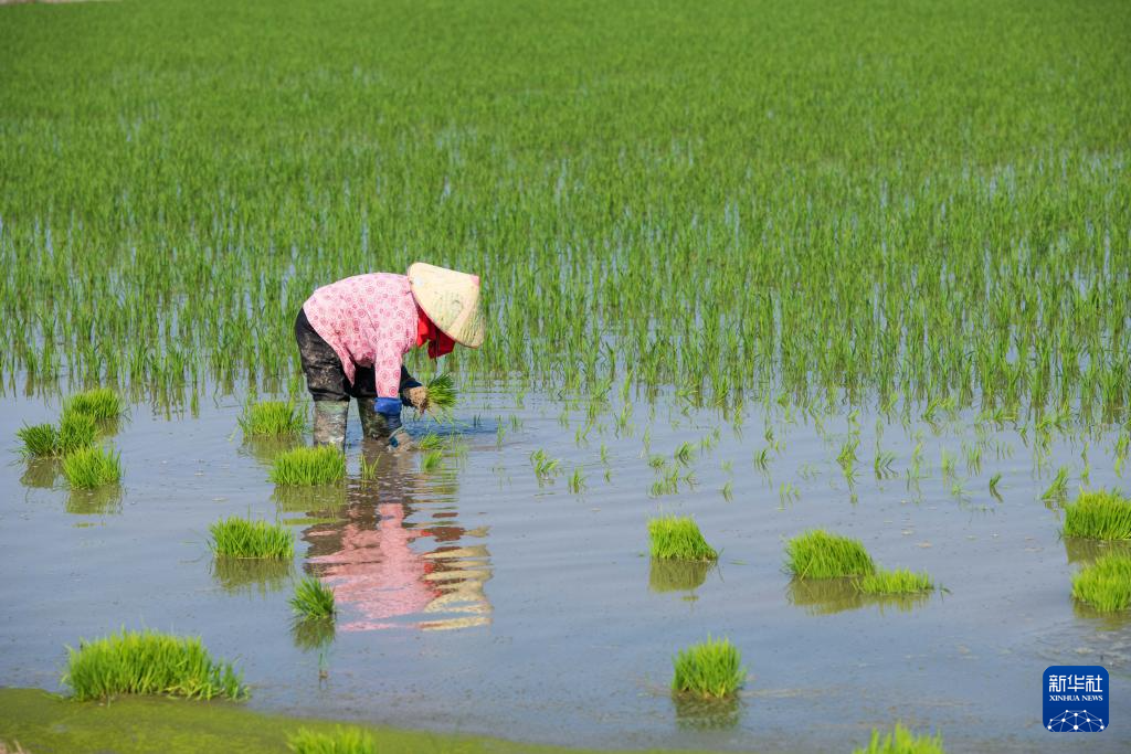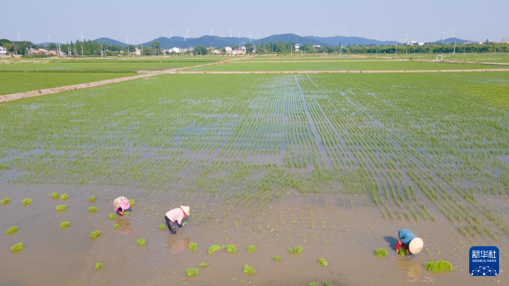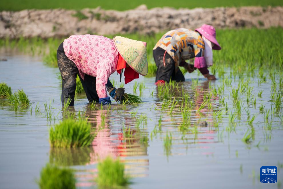 6月17日,在安徽省巢湖市槐林镇的巢湖岸边,村民在水稻田里插秧。