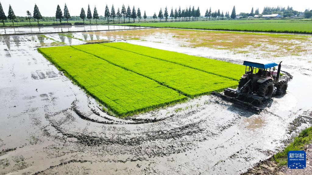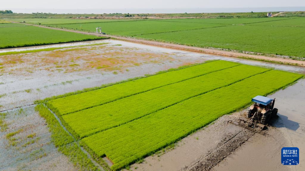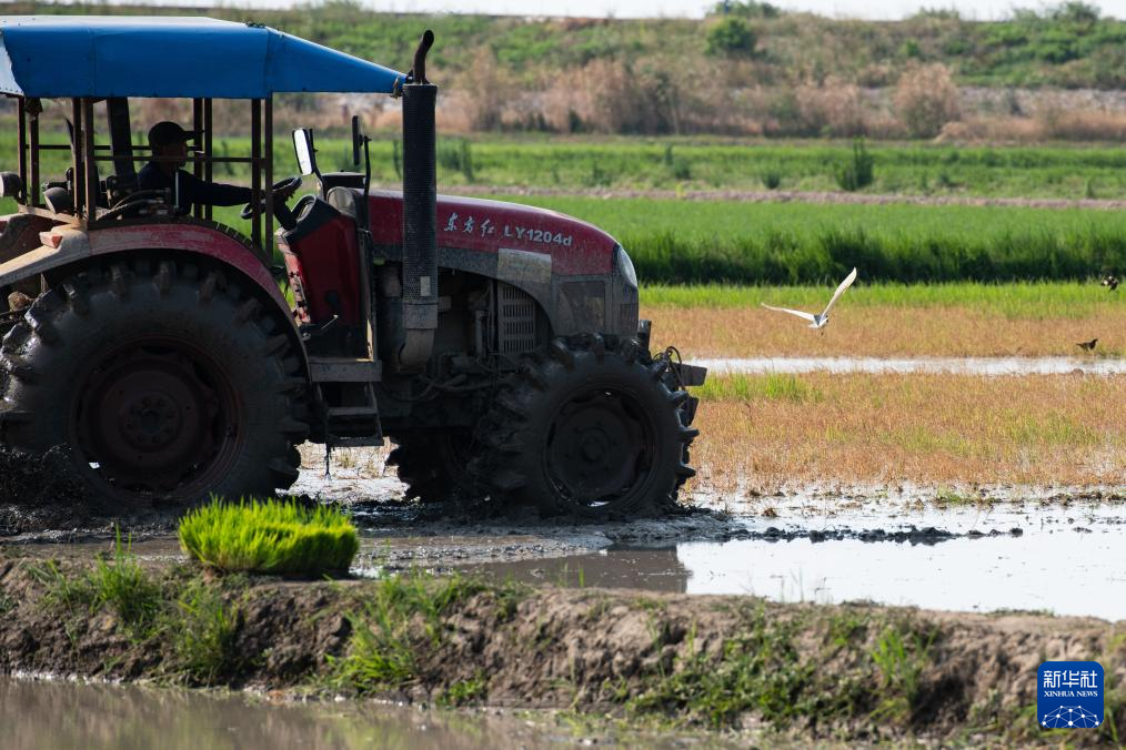 6月17日,在安徽省巢湖市槐林镇的巢湖岸边,旋耕机在水稻田里作业。