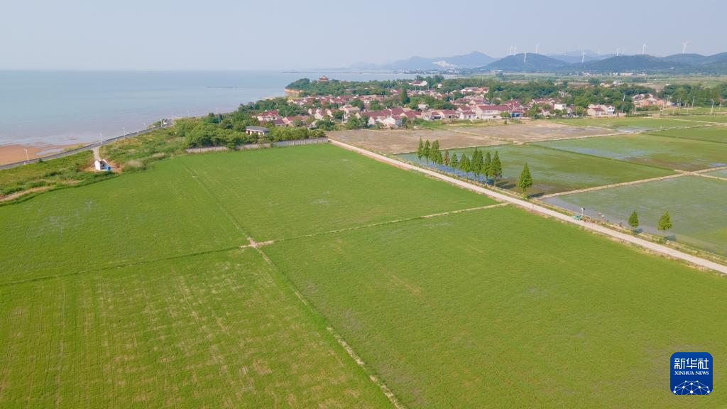 这是6月17日拍摄的安徽省巢湖市槐林镇巢湖岸边的水稻田(无人机照片)。