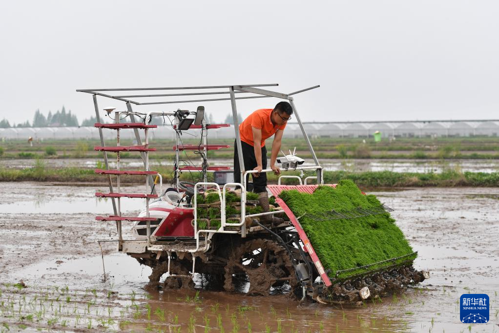 4月10日,湖南省益阳市大通湖区宏硕生态农业农机合作社工作人员调试无人驾驶水稻插秧机。