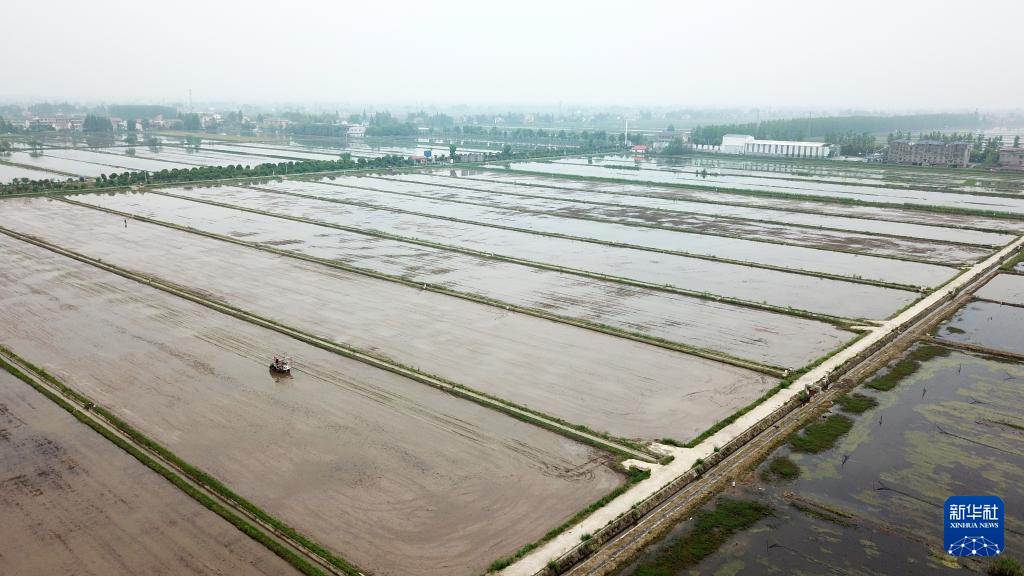 6月17日,在安徽省巢湖市槐林镇的巢湖岸边,旋耕机在水稻田里作业(无人机照片)。