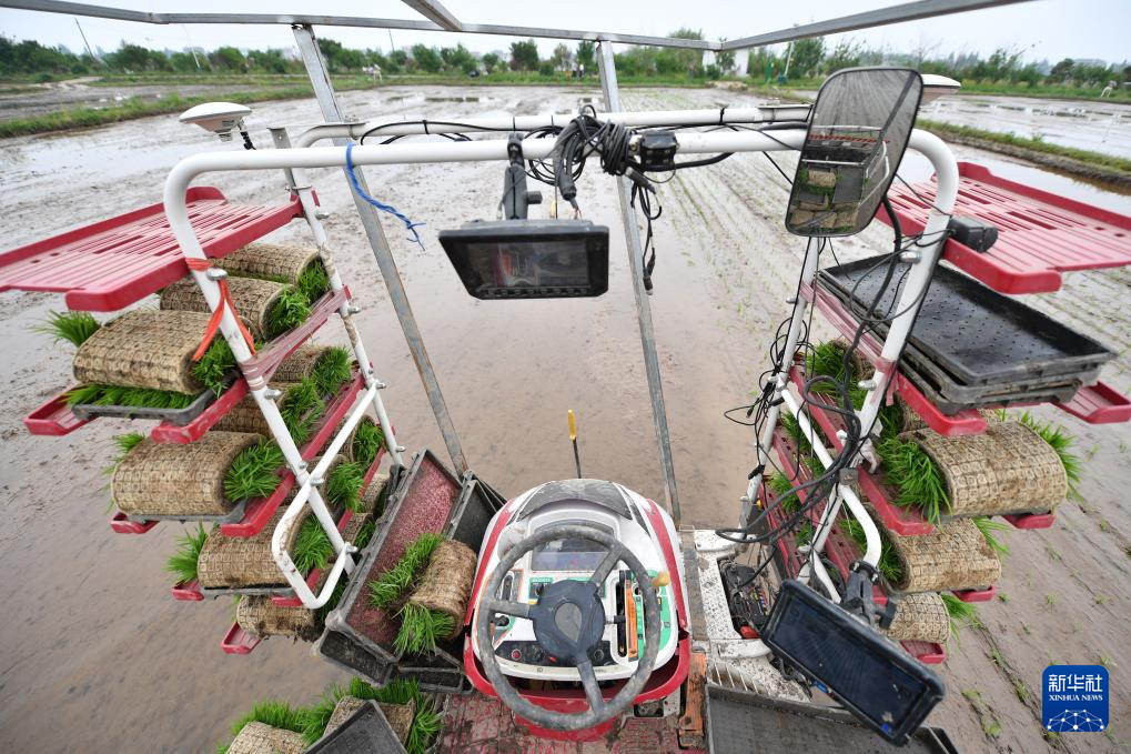 4月10日,一台无人驾驶水稻插秧机在湖南省益阳市大通湖区再生稻无人农场作业。这台插秧机可实现路径规划、插秧作业、机具升降等操作,只需人工传送秧苗。