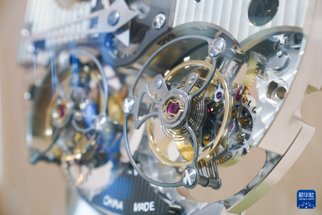 6月18日在孔雀表业(集团)有限公司展示中心拍摄的双陀飞轮机芯模型。