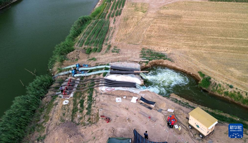 6月18日,在山东省巨野县麒麟镇的一处抗旱应急取水点,水泵正在抽水输入农田灌溉渠道(无人机照片)。