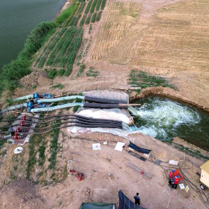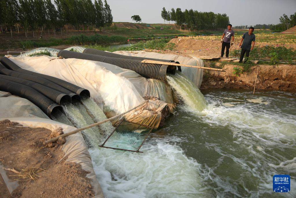 6月18日,在山东省巨野县麒麟镇的一处抗旱应急取水点,工作人员在观察输水情况。