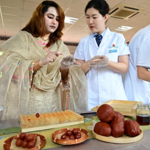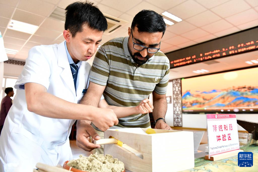 6月18日,在青岛西海岸新区中医医院,青岛大学国际教育学院留学生在体验山楂丸制作。