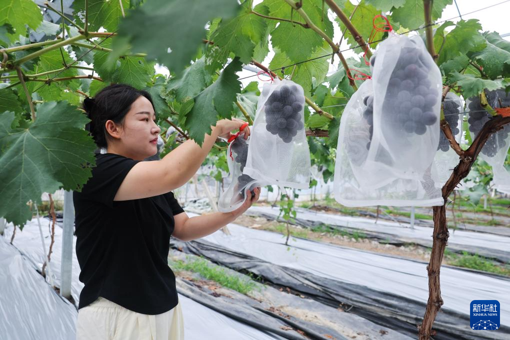 6月19日,邓美琳在葡萄大棚里采收刚成熟的葡萄。邓美琳2017年毕业后返回嘉兴市南湖区大桥镇,创立旅游文化公司、家庭农场以及南禾共富工坊电商直播间。她通过社区营销、直播带货等模式,将本地的优质水果带向市场,实现农产品品牌价值的提升,为农户们带来实实在在的收益。