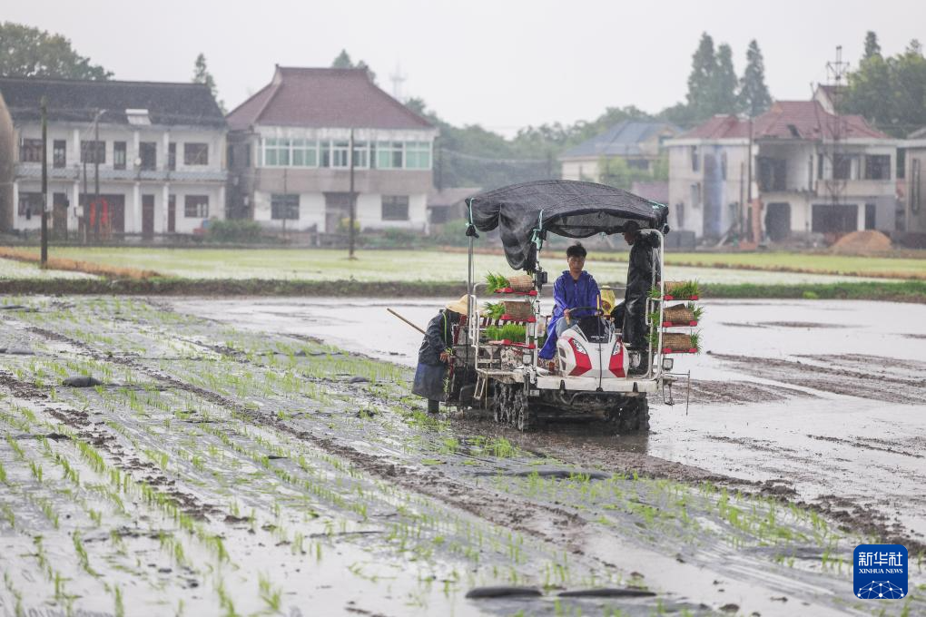 6月19日,蔡月琴的丈夫洑文刚驾驶覆膜插秧机进行覆膜插秧作业。